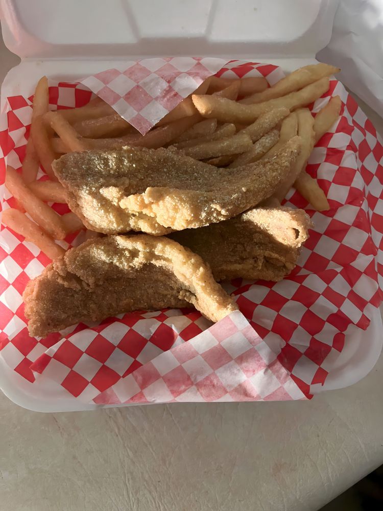 Freshly battered catfish nuggets served with fries, bread and a can of soda